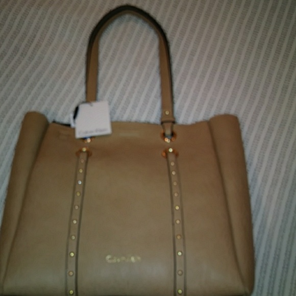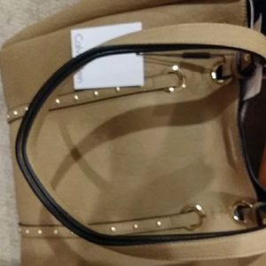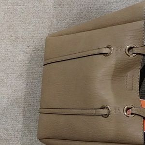 Tan peppled leather large 2- habdle tote handbag roomy interior, matching clutch. Brand new. Tags atrached.