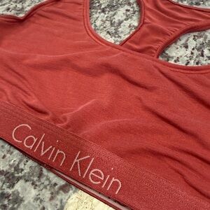 Calvin Klein racerback sports bra in a muted rust red. Elastic logo band for light support. Smooth, breathable fabric for comfort. Simple pull-on design for easy wear.
