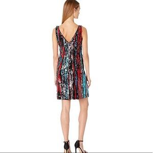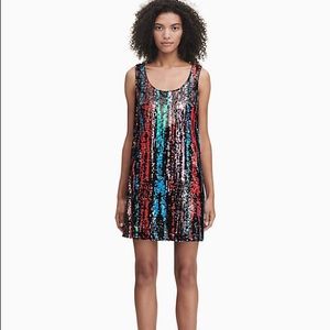Embellished with allover sequins, this on-trend sleeveless dress features rainbow coloring, a scoopneck, a v-back with a zip closure and a fitted sheath silhouette.