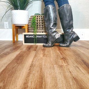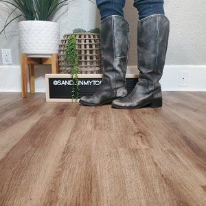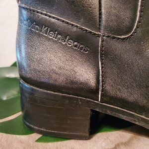 Calvin Klein Jeans Brand: Rare Distressed Grey Riding Boot, Size 8. The manufactured intentionally distressed the leather for an "aged" look, the scuffs and distressing you see is intentional. The low heel soles have been replaced, the boots were polished at that time, soles do show signs of use. They have not been worn since the heel replacement. They are in excellent used condition, comfy and roomy. I have a wide foot, these fit me well, with plenty of room in the toes (which is rounded). See photos for measurements, as the interior shot of the size was hard to take. CKJ stamped on the heel outside and labeled on the back. These are up to the knee riding boot style. These are not rain boots per se but I have worn them in a light rain without issues. Modeling picsfor style and fit ideas only.