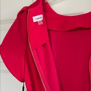 Chic Calvin Klein jumpsuit in bright pink. This jumpsuit looks gorgeous on! Features a sleek design with a matching belt. Perfect for any occasion.