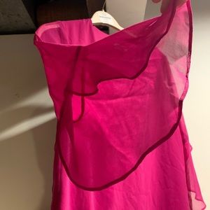 Barely worn, bright pink loose fit v-neck Calvin Klein Rauli blouse with 3/4 sheer bell sleeves. Size medium