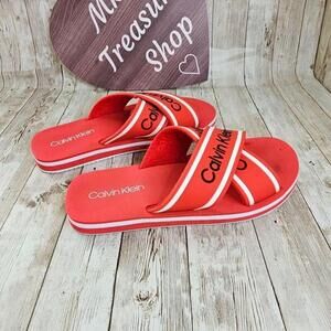 These Calvin Klein cross-band sandals are perfect for the summer. They are a bright red color and have a white Calvin Klein logo on the strap. The sandals are made of a soft, rubber material and are very comfortable to wear. They are perfect for the beach, the pool, or just running errands around town.