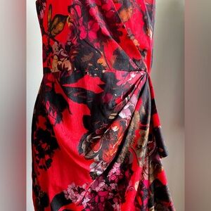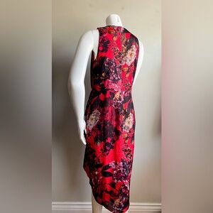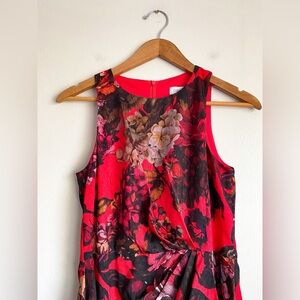 Calvin Klein Red Floral Sheath Dress Cascade Pleated Dark Romantic Wedding Midi