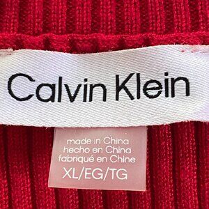 Calvin Klein. Red rib-kit dress ("new" without tags) that would be perfect for the upcoming holidays. Stylish with left side slit bout 26" from under arm to top of slit (Slit is approx. 12"-13") and measurement from under arm to bottom of dress is approximately 38"-39". 75% Rayon and 25% Nylon makes this a comfortable dress that can be dressed up or down with your favorite accompaniments of jewelry or scarf.
