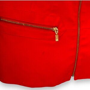 Brighten your wardrobe with this gorgeous Calvin Klein red zip-front jacket, size 2. Features a flattering fitted silhouette, gold zipper details, and a subtle peplum back for a polished, feminine look. Vibrant red color stands out beautifully and pairs well with both casual and dressy outfits.