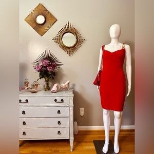 Great pre-loved condition. Beautiful fitted sexy dress with unique metal gold strap. Fits amazing!