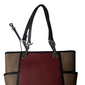Calvin Klein Red Tan Color Block Silver Hardware Tote Purse