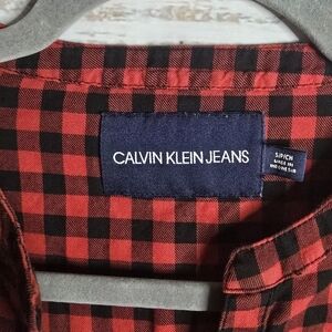 Calvin Klein womans size small, checkered red and black button-up v-neck longsleeve shirt. No rips, holes, or stains. In great condition. 100% Cotton.