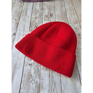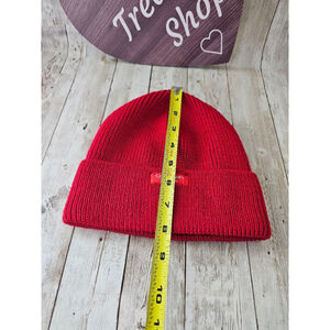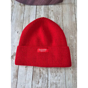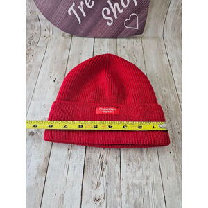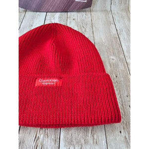 This is a new, red Calvin Klein Fragrances beanie. It is made of 100% polyester and has a ribbed knit texture. A small Calvin Klein Fragrances woven label is attached. The item is in new condition without tags or original packaging.