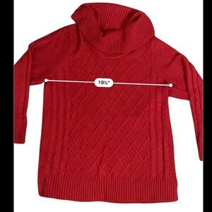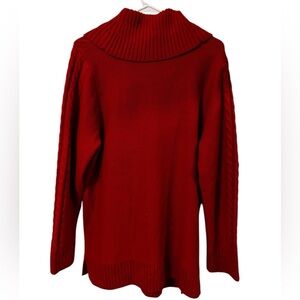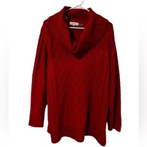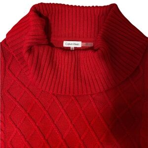 red knit cowl neck Calvin Klein sweater. Can be worn as a sweater dress if you’re smaller than XL. Beautiful knit pattern in the front. Plain in the back. Super soft fabric and absolutely gorgeous in person.