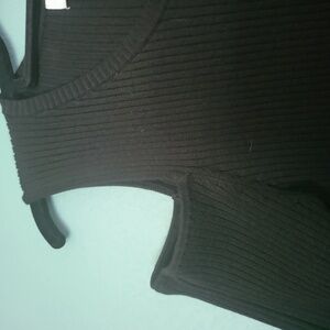 Ribbed black sweater with cold shoulder design. Modern and stylish for any event. Size is small but made of stretchy material thay could also fit a medium. EUC