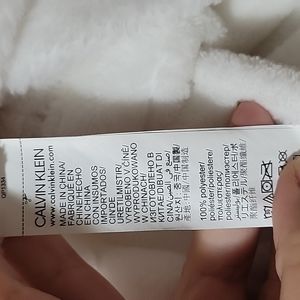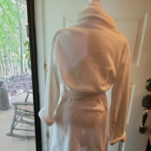 Fuzzy white bathrobe that ties at the waist. super comfy.