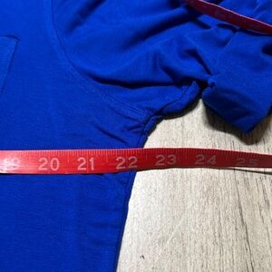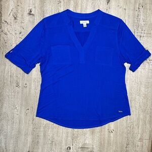 Womens Calvin Klein rolled short sleeve v-neck blouse. There is a small spot on the front pocket (see last photo) All Measurements are taken flat and are approximate.