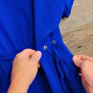 Chic Calvin Klein midi dress in royal blue. Features buttoned short sleeves and a stylish side tie.