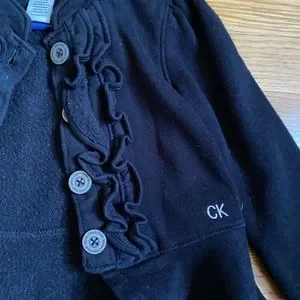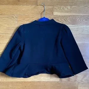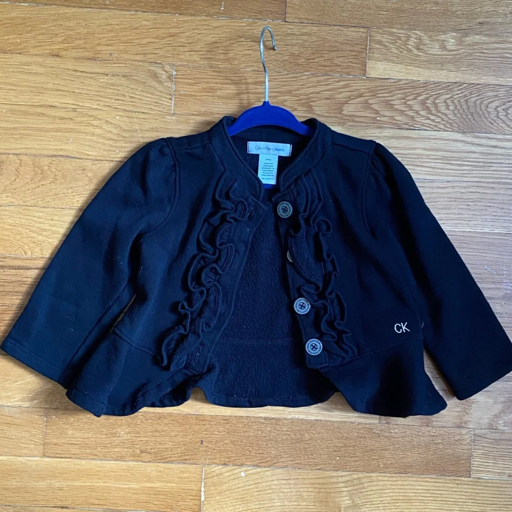 Every little girl will charm in this flattering black jacket with ruffles. Dress it up or dress it down. She can wear it to the park or to a fancy event. A little dust got on it from my floor while taking pictures of it, but I’ll make sure to wash before shipping!