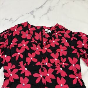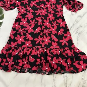 Calvin Klein Ruffle Trim Shift Dress Size 14 Black Pink Floral Button Trim