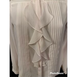 Beautiful ruffle front blouse with pintuck pleats. Round neck, long sleeves. Size Medium Petite.