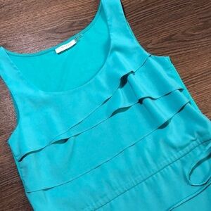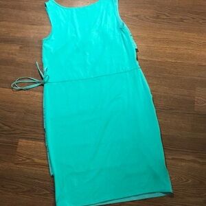 Get ready for warm spring days in this flattering sleeveless sheath from Calvin Klein in a sweet mint green. Perfect for an evening on spring break with the family with a jean jacket overtop and block heels, and could also be worn in the office with a blazer. Note: one small area of discoloration as pictured. Will likely come out with a dry clean. No other known flaws. Size 2.