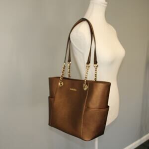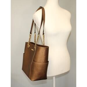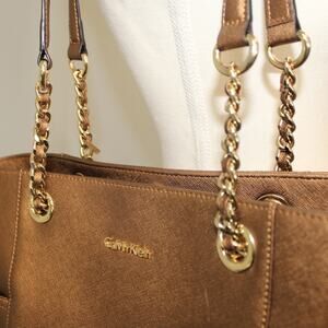Calvin Klein Saffiano Chain Leather Tote Bronze Very Good Purse Pockets 10x15