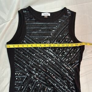Elevate your wardrobe with this stunning and super soft Calvin Klein tank top featuring a dazzling sequined geometric design. Made from high-quality materials, this size small top is perfect for a night out or special event. Pair it with your favorite jeans or a chic skirt for a stylish and eye-catching look. Don't miss out on adding this must-have piece to your collection!
