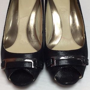 Calvin Klein Sera Buckle Shimmer Peep Toe Wedges Sz 7.5W