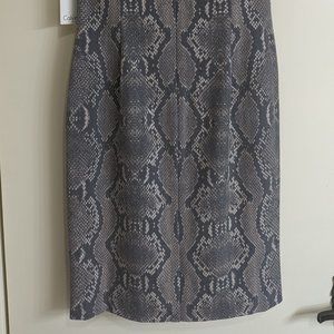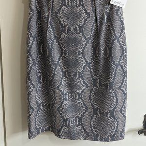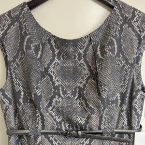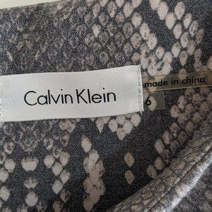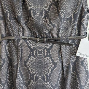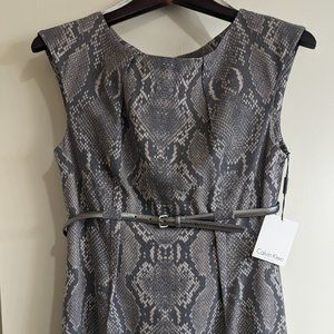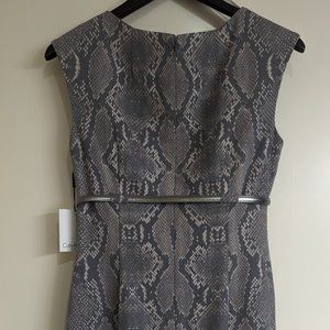 Head-turning snakeskin pattern on this New With Tags Calvin Klein sleeveless sheath dress is a MUST HAVE. Belted waist, sleek fit, and slight scoop neckline. Fully-lined. Back zipper for easy entry. Size 6.