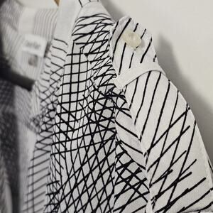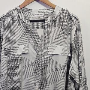 The Calvin Klein Sheer Black & White V-Neck Roll Tab Sleeves Button Blouse in size 2X is a stylish and versatile top suitable for various occasions such as travel, weddings, parties, workwear, and more. Made from lightweight and sheer 100% polyester fabric, this tunic-style blouse features a geometric pattern in black and white, with logo buttons accenting the design. The V-neckline, long sleeves with roll tab details, and hand wash care instructions add to the overall appeal of this designer piece. Perfect for the fashion-forward woman looking for a classic and sophisticated addition to her wardrobe.