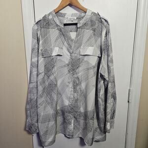 Calvin Klein Sheer Black & White V-Neck Roll Tab Sleeves Button Blouse Size 2X