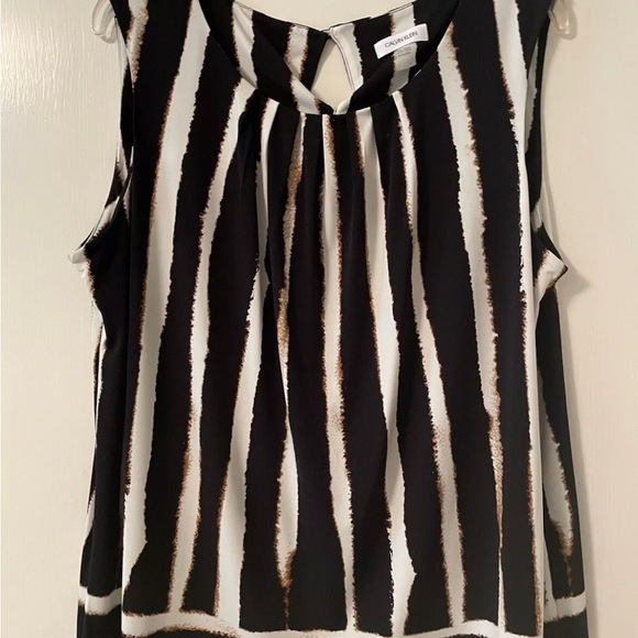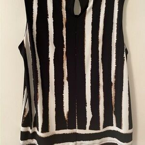Sleeveless top with soft pleating at neck front . Single button closure at back of neck, pit to pit 21” and length 25”. EUC. No wrinkles and easy care. Black brown and ivory