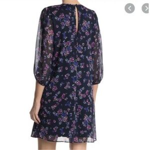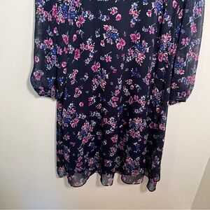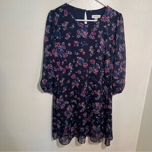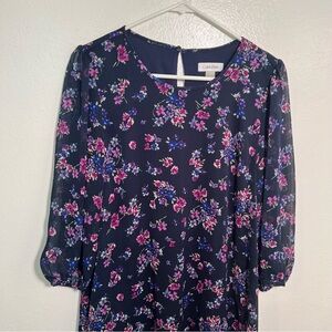 Great condition. Calvin Klein. Shift Dress. Navy blue with purple and green floral pattern. Sheer 3/4 sleeves. Keyhole in back. Lined. Size 8. Missing material tag. Pit to pit laying flat 19” Shoulder to hem 34” Sleeve (shoulder to hem) 17”. All measurements are approximate and taken lying flat. Smoke free home. No trades, offers welcome.