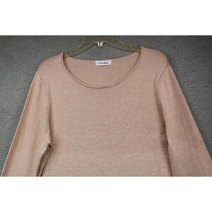 This is a Calvin Klein Peach Metallic Sweater that is a size Large. It has bell sleeves and is shimmery in the light. It is 61% Rayon, 19% Nylon, and 7% Metallics. Laying flat, it measures: Armpit to armpit-21" and the length is 27". The size tag is missing. It is in great condition and very soft.