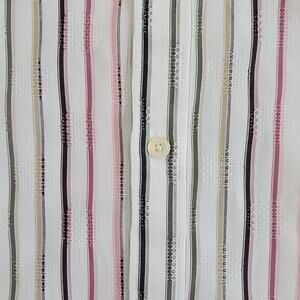 For sale, this Calvin Klein Men's Casual Button-Up Shirt, size 2XL, featuring a stylish striped pattern in a soothing blue, pink, and white palette.