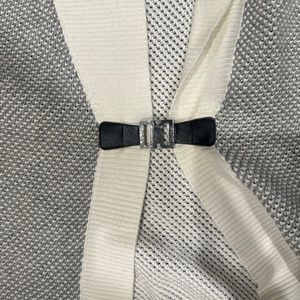Knit cardigan. Short sleeve. Buckle closure. 55% Cottom 37% Viscose 8% Polyester. Grey and white.