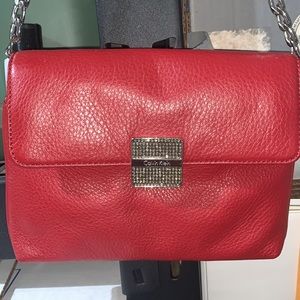 Great pre-owned Calvin Klein leather crimson color shoulder bag. Zipper compartment with zip coin pocket, 2 slip compartments. Exterior has a slip pocket on back. Fits nice on shoulder.