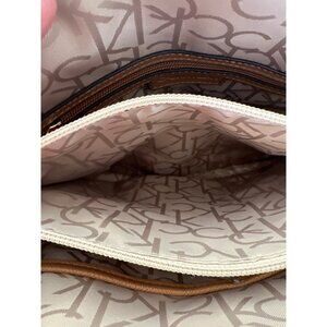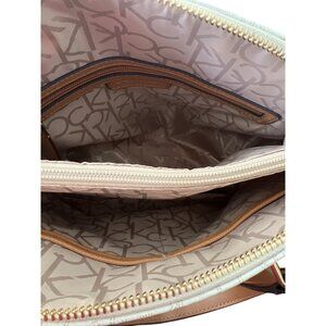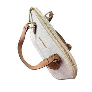 This elegant Calvin Klein satchel handbag features a sophisticated design with the iconic logo pattern on durable fabric. Beige with brown leather accents, it's an ideal accessory for elevating professional attire. Secure your essentials in style with its sturdy zip closure and comfortable dual handles, perfect for daily use.