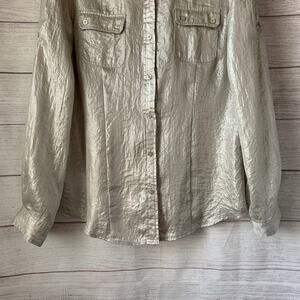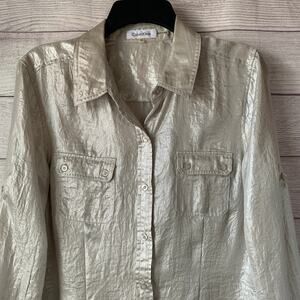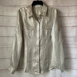 Calvin Klein Silver Metallic Button Up Shirt Long Roll Tab Sleeves Size M