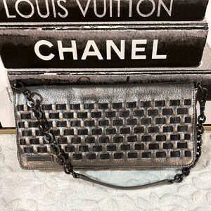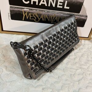Calvin Klein Silver Metallic Leather Woven Chain Shoulder Bag Clutch Pochette