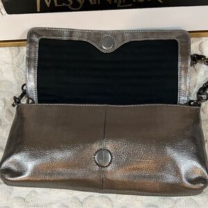 Sleek Calvin Klein silver metallic leather shoulder bag that easily converts from clutch to chain shoulder bag. Features a chic woven leather front, dark chain strap, and compact silhouette—perfect for evening, events, weddings, parties, or nights out.