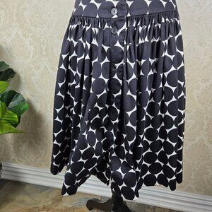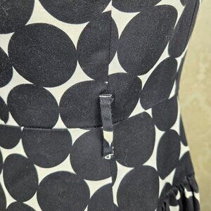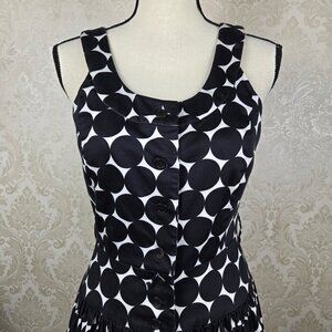 This fit and flare dress has a white backround with large black polka dots. Scoop neckline. Sleeveless. Full skirt. Buttons down the front with a snap at the neck and at thte waistband for extra security. Belt loops – there is no belt included. Torso is lined. No pockets.