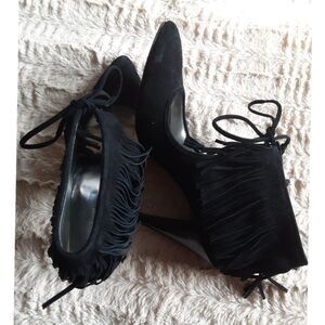 Calvin Klein Size 9M Black Suede Stiletto Lace Up Fringe Heels Statement Style