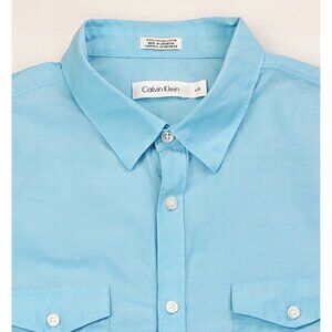 Calvin Klein Size Large Men Aqua Blue Button Short Sleeve Lightweight Logo Shirt