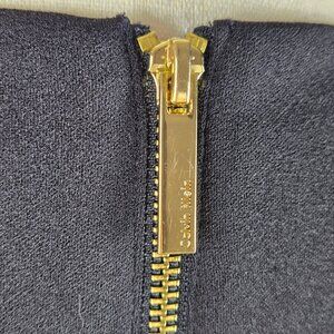 Black sheath dress has a high round neck. Sleeveless. Gold exposed back zipper. Seaming front and back for a flattering silhouette. No pockets. Unlined.