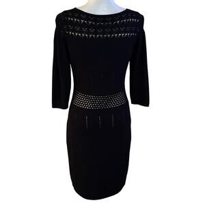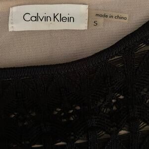 Calvin Klein knit sweater sheath dress. Open knit details. Lined. Black with beige lining. Size Small. Preowned, no flaws.