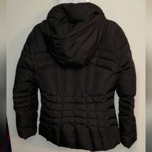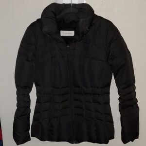 Calvin Klein Size Small Down filled faux fur lined puffer coat with hood. Hood has elastic that allows you to cinch it in for a closer fit against the elements.