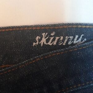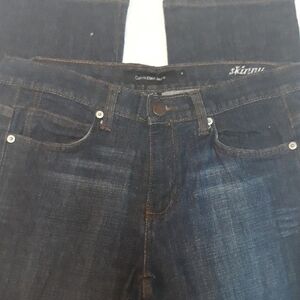 Gorgeous dark blue denim Calvin Klein Jeans, with the tan stitching and silver hardware. Skinny Jean's. Has the two front pockets, the two back pockets have a nice design in the tan and brown stitching. Has logo in brown leather top back right. In excellent condition!! Inseam is approximately 30" Rise 10", and waist lying flat approximately 15.5". Dark denim in excellent condition can be dressed up with nice sandal heels or dressed down with some Jordan's. ๐๐๐๐
