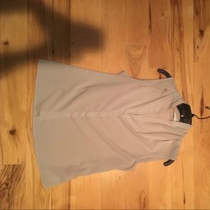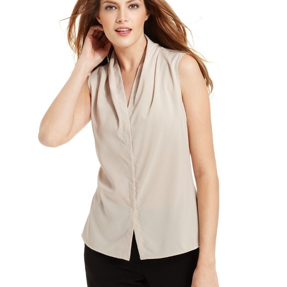 Sleek, versatile sleeveless top with drape neckline. Cool taupe, semi-sheer (nude bras are not visible but colored bras may be). 24" shoulder to hem lying flat, 14" from base of neckline to hem. Deep neckline but no cleavage. Poly/spandex material glides over curves but doesn't cling. Lightweight. Cover photo from Pinterest.