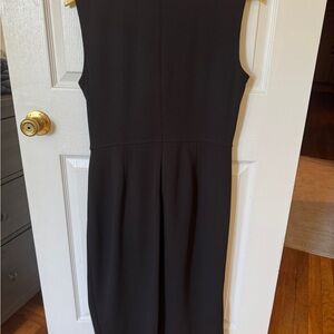 Chic black dress with a tailored fit through the waist, chest and hips. Scuba crepe construction makes this dress stretchy and supportive. Features flattering ruching with a draped ruffle accent at skirt. A classic LBD for any occasion. Excellent used condition. Size 12. Approx 41-1/2” long from center back neck to hem.
