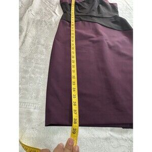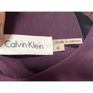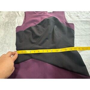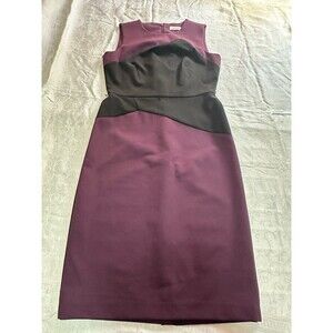 Calvin Klein Sleeveless Sheath Dress, size 4, in a striking black and purple color block design. This elegant dress features a flattering silhouette, perfect for professional settings or sophisticated events. Made from comfortable, high-quality fabric. Excellent pre-owned condition, with no visible flaws, stains, or holes. 2036