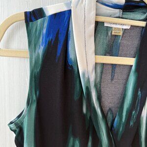 Elegant sleeveless Calvin Klein blouse with a painterly watercolor print in shades of navy, emerald, ivory, and cobalt. Features a soft draped V-neckline and stretch fabric for a flattering, easy fit. Lightweight and wrinkle-resistant — ideal for layering or wearing solo.